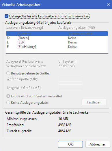 Der Screenshot stammt zwar aus Windows 11, sollte aber in 10 genauso aussehen. Aktiviere also ganz oben die Option Dateigröße für alle Laufwerke automatisch verwalten und klicke dann auf OK. Alles andere ist Murks.
