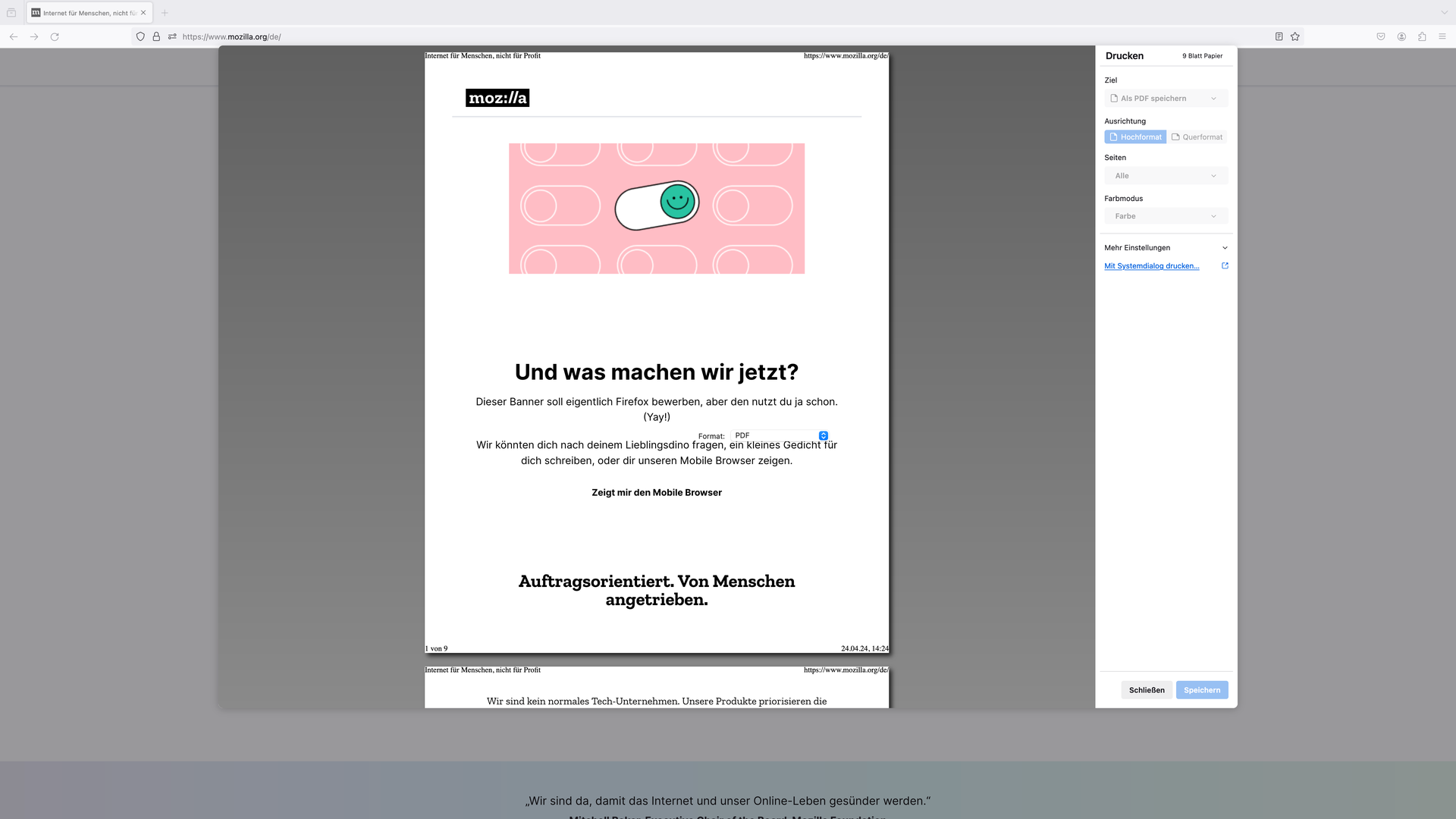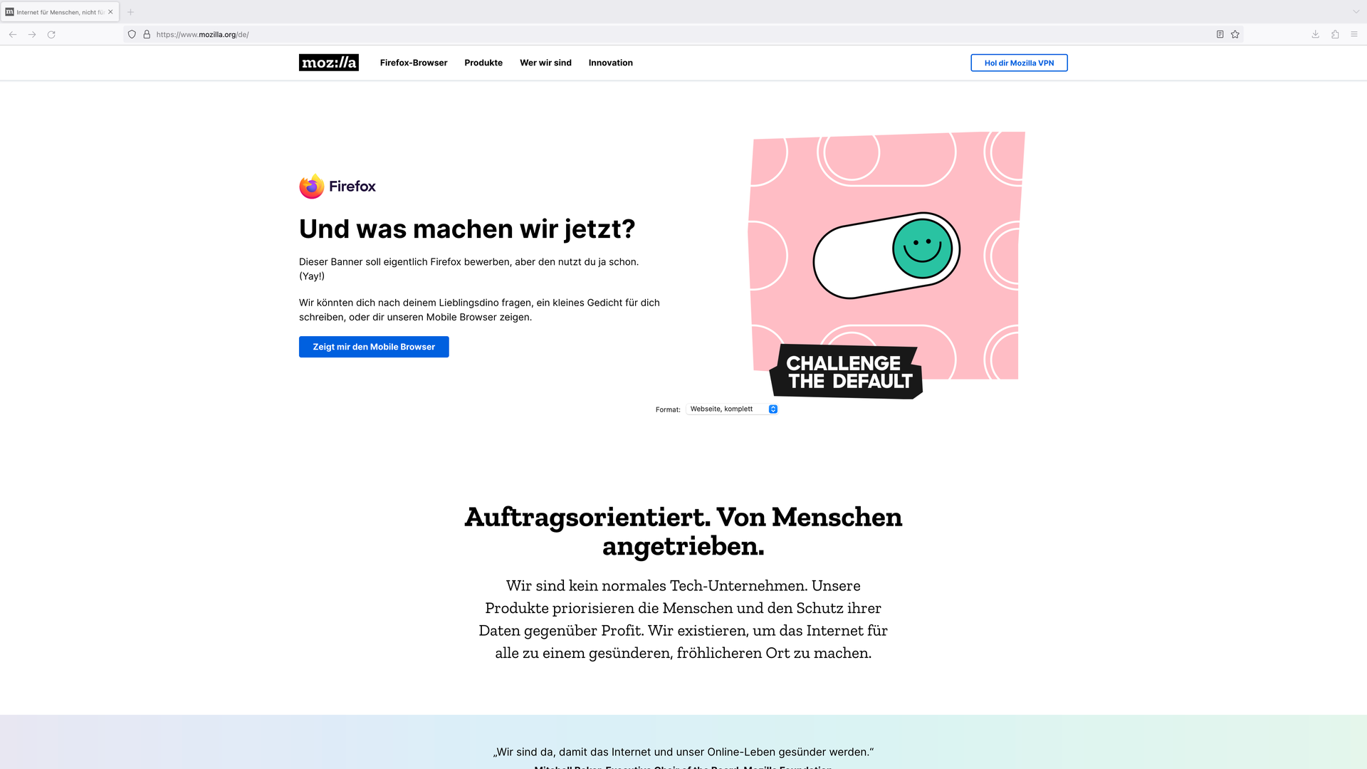 • Ein Tab einer beliebigen Webseite wie https://www.mozilla.org/de/ ist geöffnet