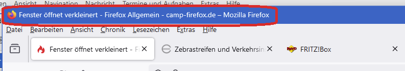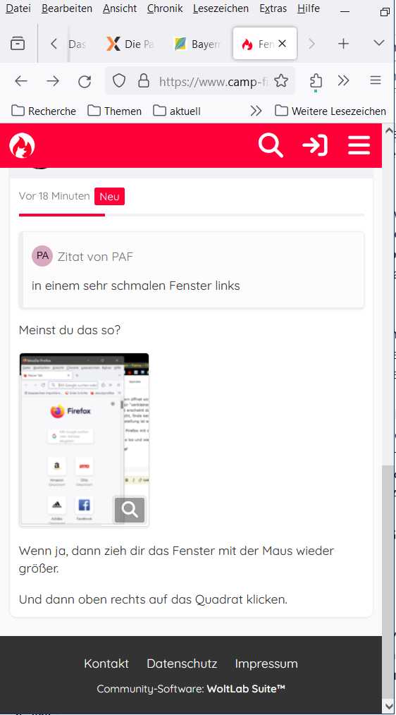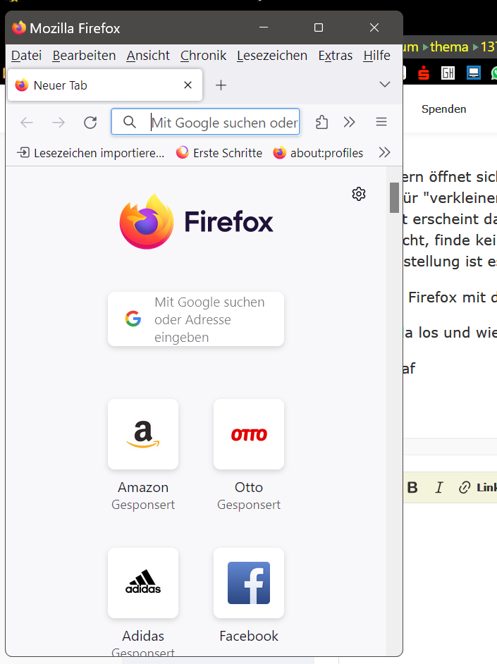 seit gestern öffnet sich FF immer in einem sehr schmalen Fenster links auf dem Bildschirm und oben rechts ist das Symbol für "verkleinern" zu sehen - ich muss da einmal draufklicken, das kleine Fenster rutscht nach rechts und dann erst erscheint das Symbol "vergrößern", sodass ich die Normalgröße aufrufen kann. Ich habe schon rumgesucht, finde keine Einstellung zur Fenstergröße beim Start. Shift-Taste drücken beim Schließen hilft nicht, und diese Einstellung ist es auch nicht https://www.pctipp.ch/praxis/firefox…ld-2409058.html.