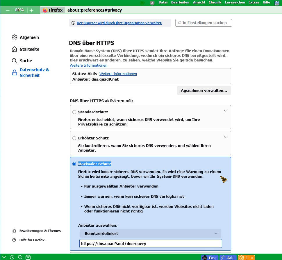 Dann habe ich bei den Einstellungen "Nur-HTTPS-Modus" und "DNS über HTTPS" herumexperimentiert, aber nichts hat geholfen.