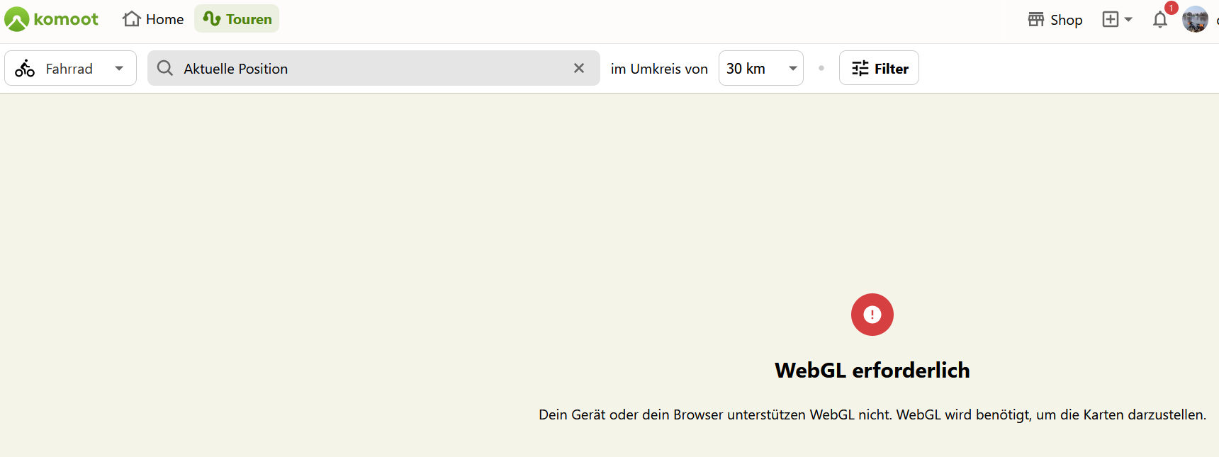 Zur Anzeige der Landkarten in Komoot benötige ich WebGL. Ich erhalte folgende Rückmeldung: