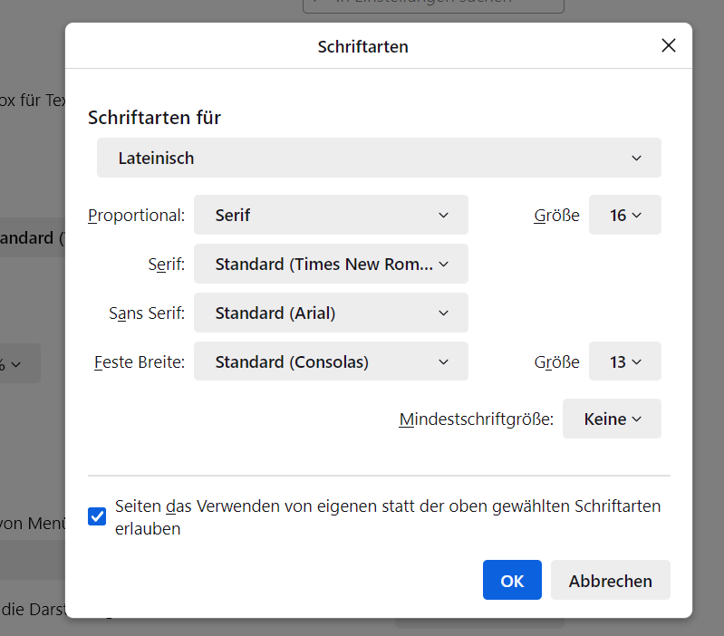 "Seiten das Verwenden von eigenen statt der oben gewählten Schriftarten erlauben"