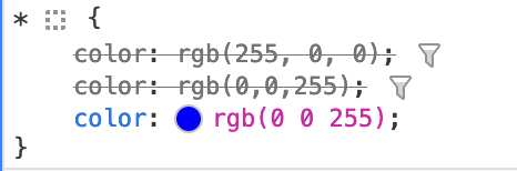 Die ersten zwei Zeilen sind nur durchgestrichen, weil sie durch die jeweils nächste überschrieben werden. Man kann in den Einstellungen der Entwicklerwerkzeuge aber auch einstellen, welche Farbdarstellung man bevorzugt. Dann wird alles in die jeweilige Schreibweise umgewandelt:
