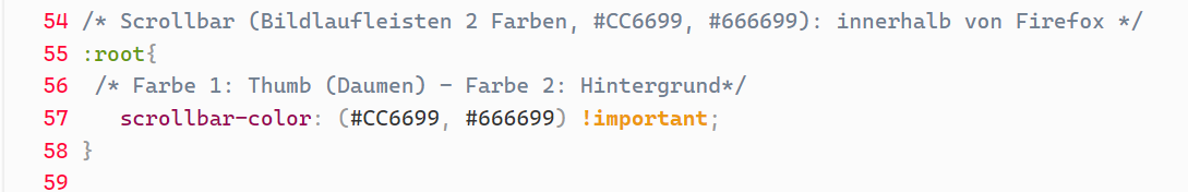 Wenn der obere Teil des Codes woanders gelagert ist, so ist es für mich neu. Deshalb fragte ständig nach, Sonst gehörte er immer zum Gesamt-Code in der CSS. Seit heute wohl nicht mehr - zumindest weiß ich es erst seit heute. Aus erneute Eingaben wegen Veränderungen reagiert Firefox nicht.