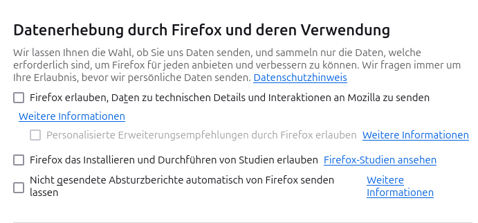 Nach der Fertigstellung von Ubuntu habe ich Firefox aufgerufen und direkt die Einstellungen entsprechend meinen Vorstellungen angepasst. Dabei habe ich auch die per default aktivierte Einstellung "Firefox das Installieren und Durchführen von Studien erlauben" deaktiviert.