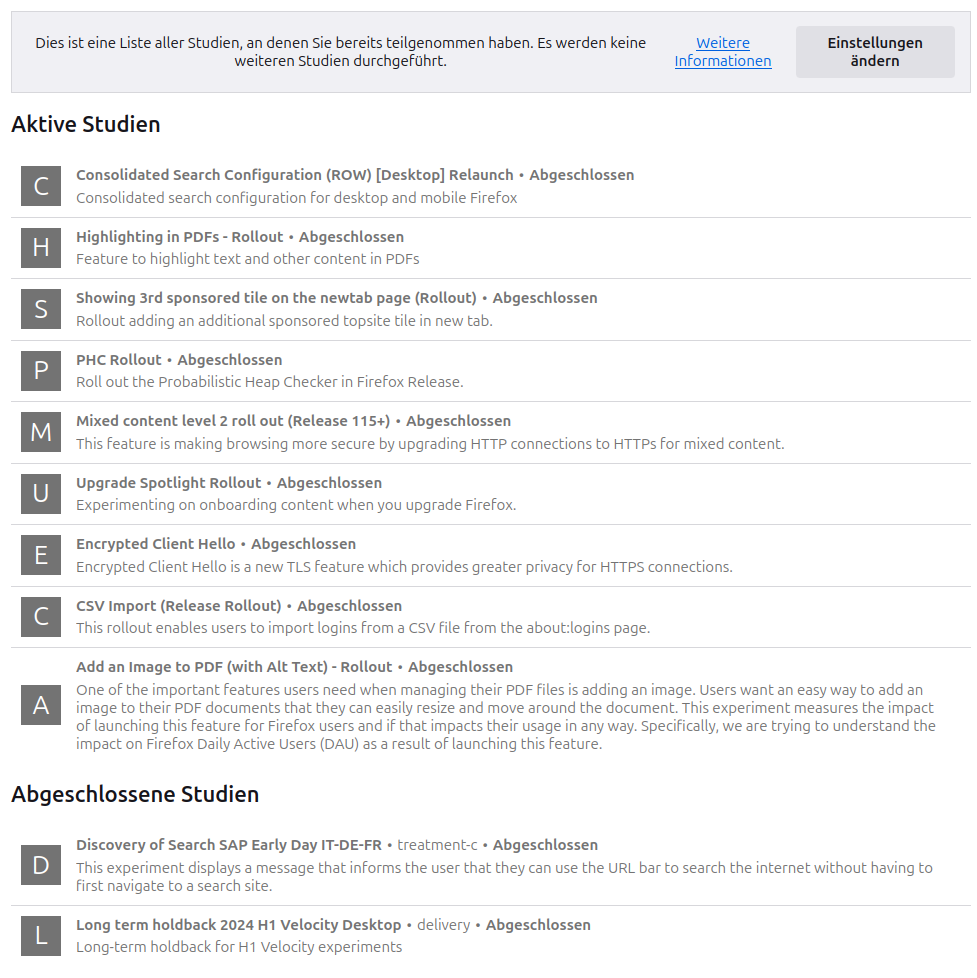 Dennoch wird mir unter Firefox-Studien angezeigt, dass ich angeblich an diversen Studien teilgenommen hätte?
