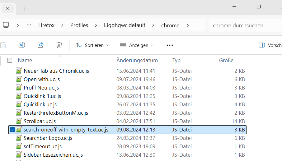 Und ich habe geschrieben, dass habe ich alles seit Jahren schon. Ich habe das Teil in den (Profil) chrome Ordner geschoben, dort sind schon andere uc.js drin (von hier) - Trotzdem geht es nicht und ja in der userchrome is userChrome.import("*", "UChrm"); drin, damit er alles lädt.