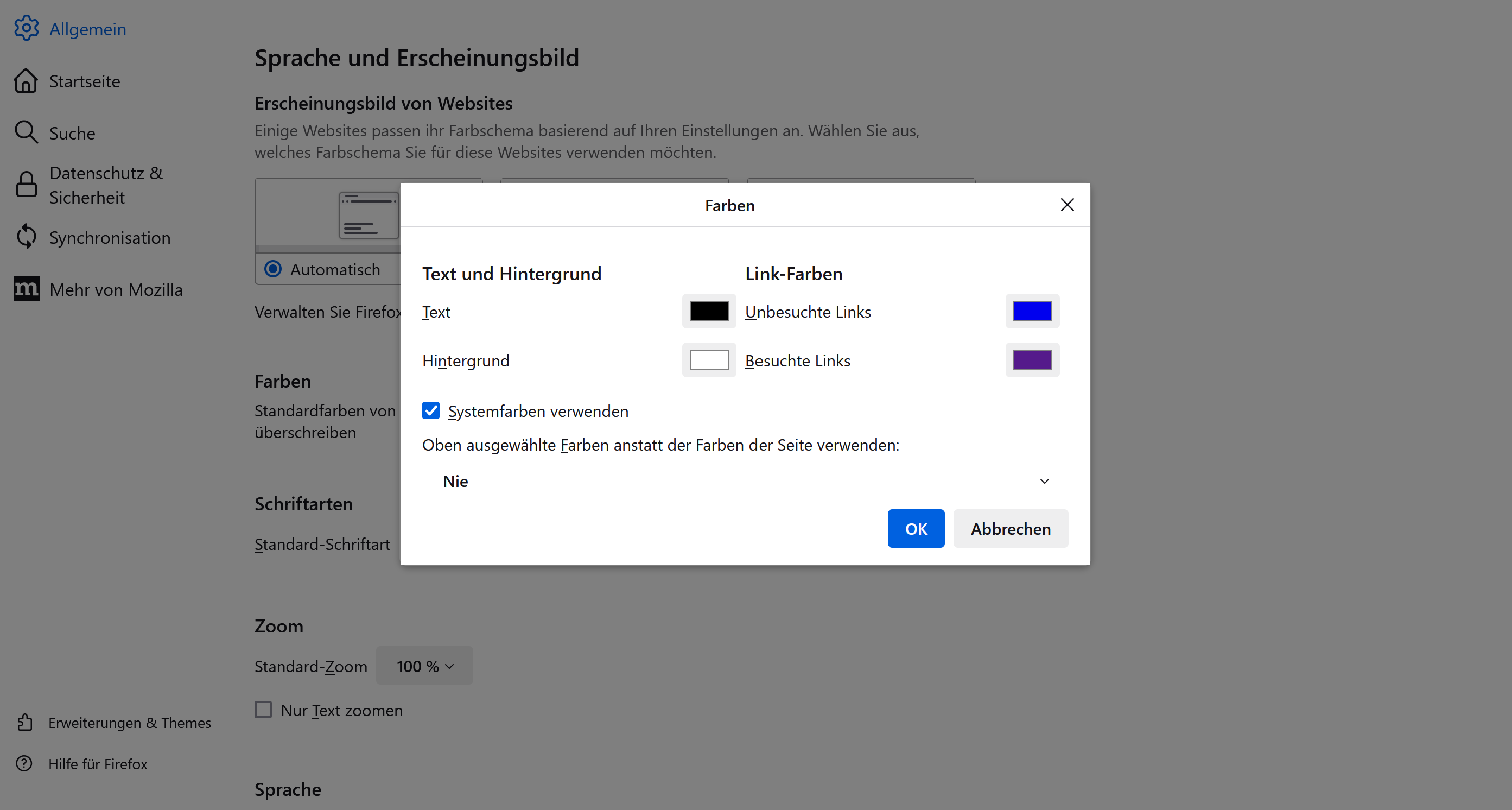 Edit: Ich habe gerade auf einer anderen Seite bemerkt, dass der Hintergrund bei Buttons einfach immer auf weiß und nicht auf die Vordergrundfarbe gesetzt wird. Ich habe das aber eigenltich in der Farbverwaltung deaktiviert (Siehe Bild)