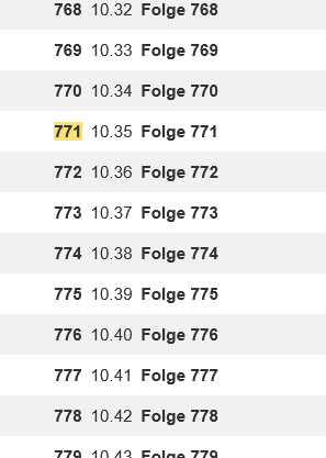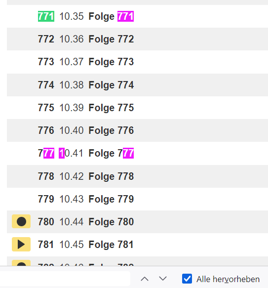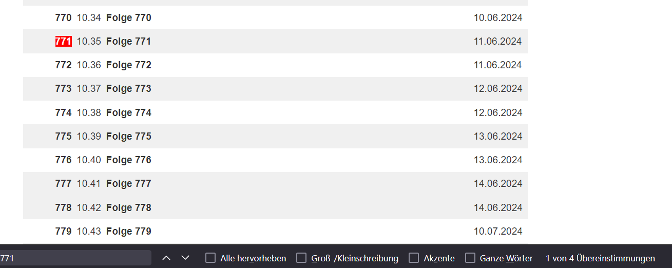 Gefunden wird nun nicht nur korrekterweise die Zeile "771 10.35 Folge 771 11.06.2024" mit zwei Übereinstimmungen, sondern auch "777 10.41 Folge 777 14.06.2024" da der Suchbegriff zellenübergreifend entsprechend zutrifft.