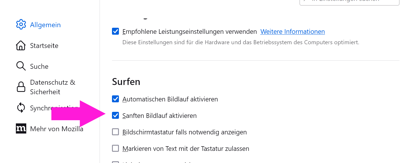 mir ist bei den letzten beiden Firefox Updates aufgefallen das jedesmal nach Update der Haken bei "Sanftes Scrollen" weg ist und ich ihn immer anhaken muß.