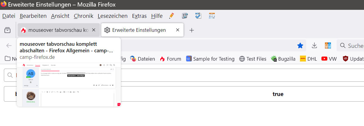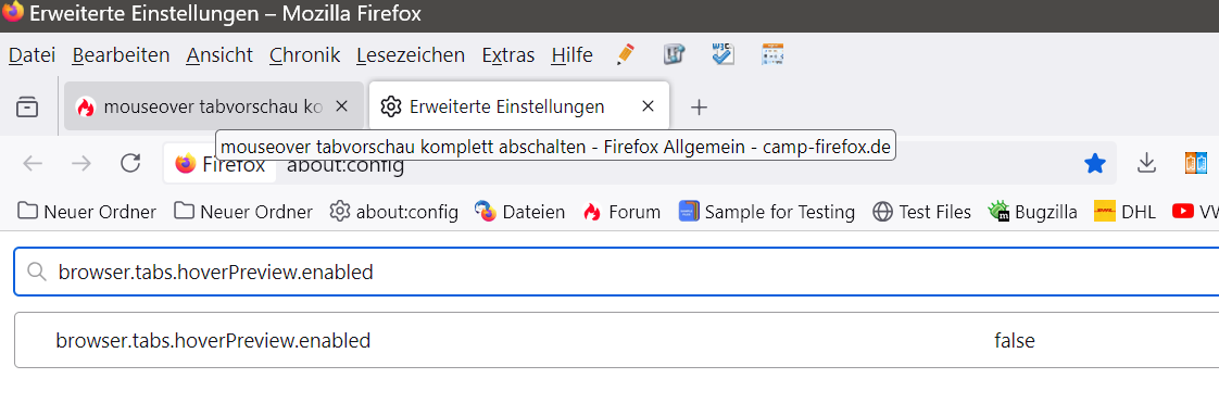 Du müsstest dafür in about:config den Schalter browser.tabs.hoverPreview.enabled auf false stellen dann sollte die Hovervorschau deaktiviert sein.