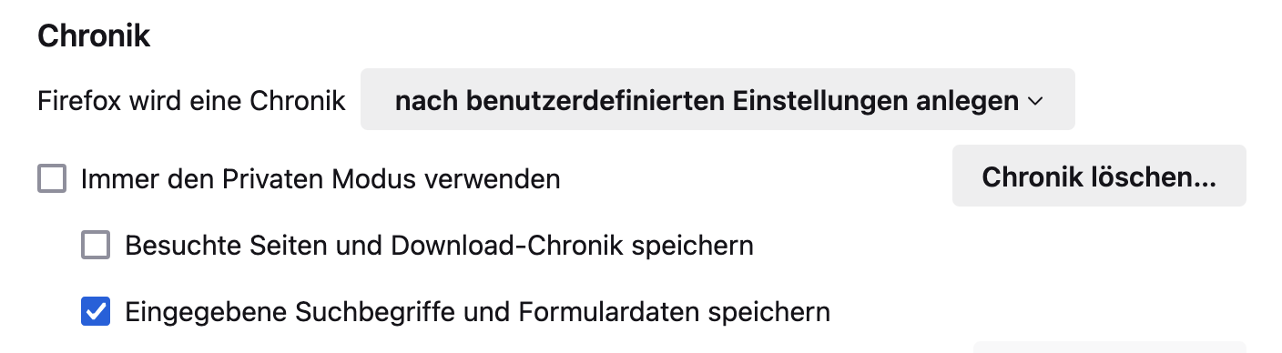 Aber in Einstellungen - Datenschutz - Chronik - Die Chronik löschen, wenn Firefox geschlossen wird - Einstellungen - Chronik
