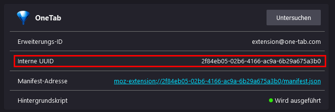 Sollte es hier zufällig dieser Ordner sein, der voll läuft, könnte ich über die UUID wie gezeigt und about:debugging so feststellen, welche Erweiterung da extrem Daten hortet.