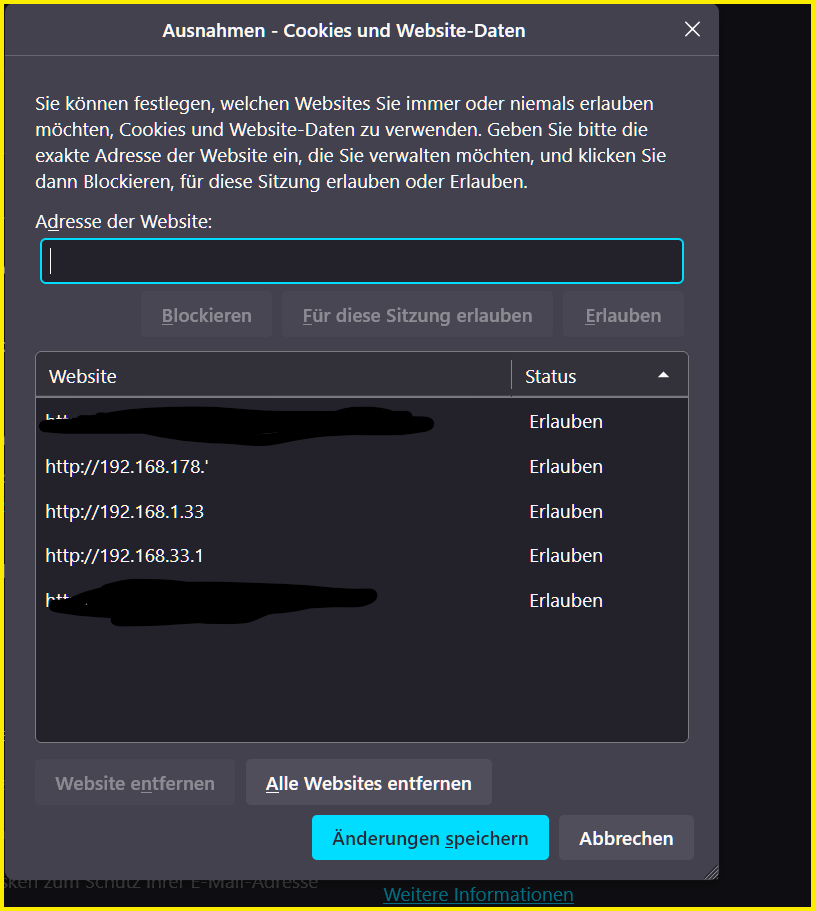 BEISPIELE gesucht: Einstellungen => Welches Format für: Ausnahmen "Adresse der Website:"