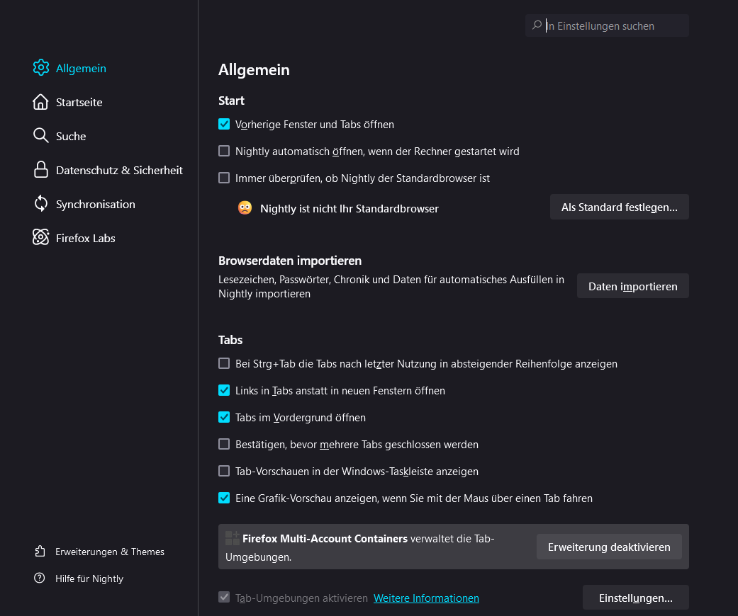 In welcher Firefox-Version soll das so aufgeteilt gewesen sein? Ich will nicht ausschließen, dass ich ein Design nicht mehr im Kopf habe. Aber das vorherige Design hatte acht Kategorien. Früher, als die Einstellungen in einem Dialog waren, waren es sieben Kategorien (wobei eine Kategorie „Feeds“ war, was es als Funktion jetzt nicht mehr gibt). Aktuell sind es sechs Kategorien, ab Firefox 130 mit Firefox Labs auch wieder sieben Kategorien. Das neue Mockup zeigt zehn Kategorien. Vor allem daran, dass das Ausfüllen von Daten, Berechtigungen, Sprachen oder Barrierefreiheit jemals eigene Kategorien waren, kann ich mich nicht erinnern. Dafür fällt „Allgemein“, was es in allen Einstellungs-Designs gab, die ich im Kopf habe, in dem Prototyp weg und wird über die anderen Kategorien verteilt. Dazu kommt, dass innerhalb der Kategorien nicht mehr alles untereinander auf einer Seite ist, sondern eine zweite und teilweise sogar dritte Ebene genutzt wird. Für mich ist das schon ein deutlicher Unterschied zu früheren Einstellungs-Strukturen von Firefox. ![]()