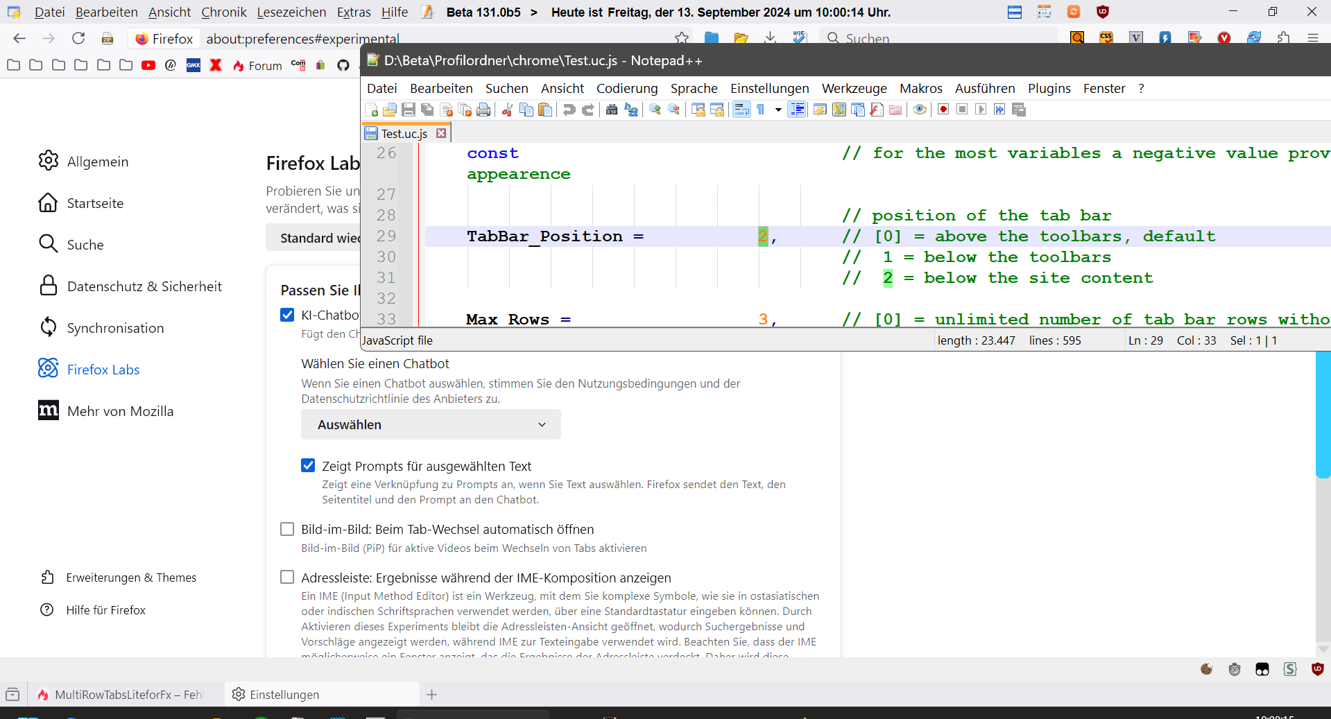 Funktionell ist darin nichts geändert. Er hat nur eine Namensveränderung und eine Code-Kompaktierung von mir quasi 1:1 übernommen. Dabei hat er aber programm-technische No-Goes eingebaut, nämlich er definiert 2 nur lokal genutzte Variablen ohne let, was mit "use strict"; kollidiert. Weiterhin definiert er manche nur lokal genutzte Variablen mittels var als global. Beides habe ich in meinem Code korrigiert.