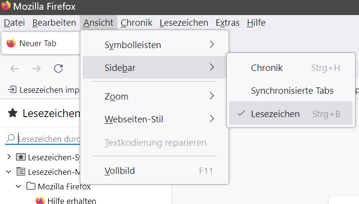 Wenn ich Firefox starte, öffnet sich gleichzeitig links die Lesezeichen-Sidebar.