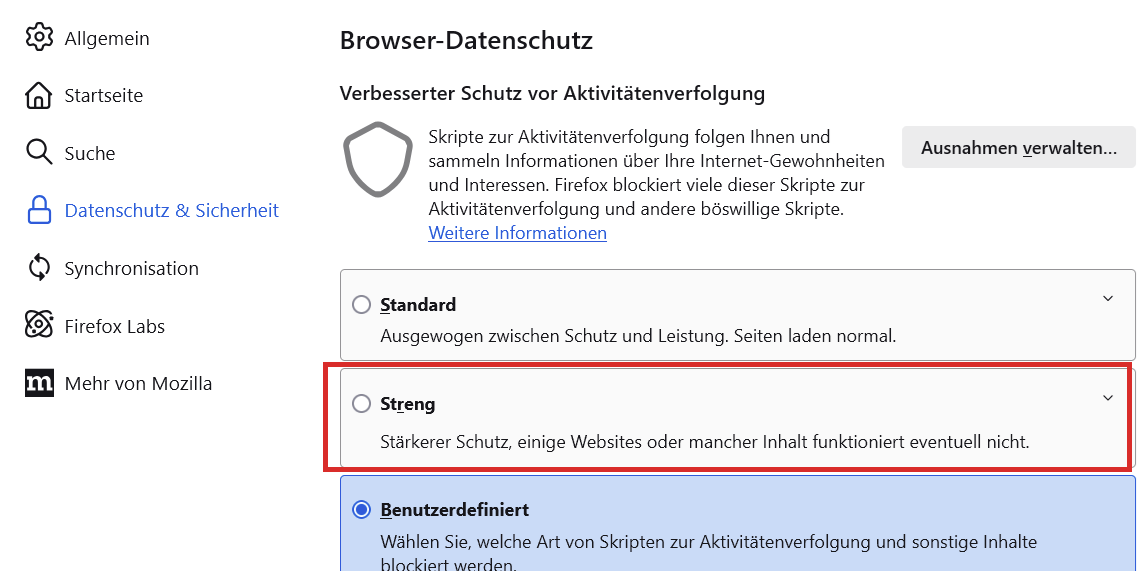 schon länger habe ich das Problem, dass ich auf Amazon bei einem Klick auf "Jetzt Kaufen" eine leere Seite bekomme. Ich dachte das liegt an einer Erweiterung (AdBlock oder so). Hab' das ganze jetzt in einem neuen Profil ohne Erweiterungen versucht und hier passiert das gleiche. In Chrome geht es. Passiert auf auf meinem Notebook unter Ubuntu 20.04.