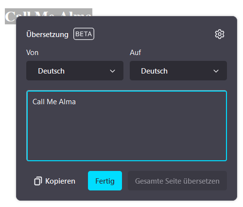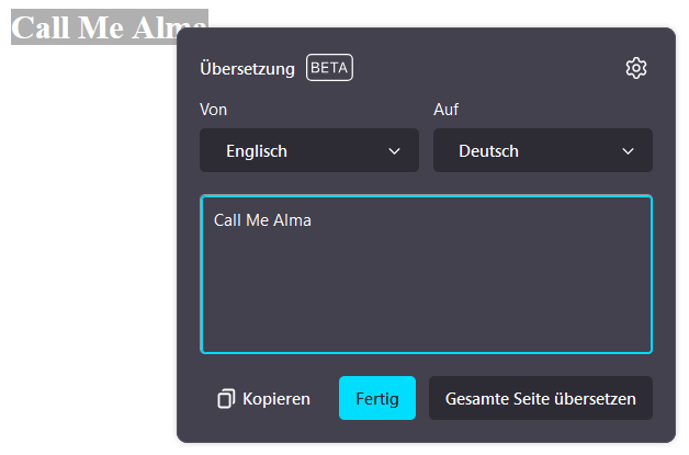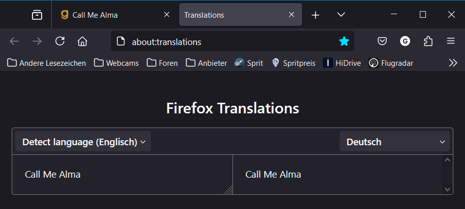 Ich bin noch auf meinem alten Rechner, kann also nicht übersetzen. Ich würde aber erwarten, dass dann Alma stehen bleibt. Aber zumindest Call und me sollten dann übersetzt werden.