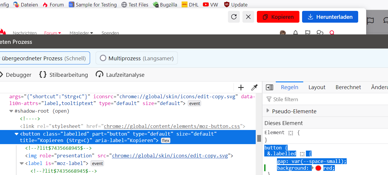 mit erwähnter Änderung war es mir halt möglich, die Elemente in den Browser-Werkzeugen anzusprechen und auch zu ändern, nur das Speichern hab ich nicht hinbekommen; und natürlich nicht im Nightly, richtig.