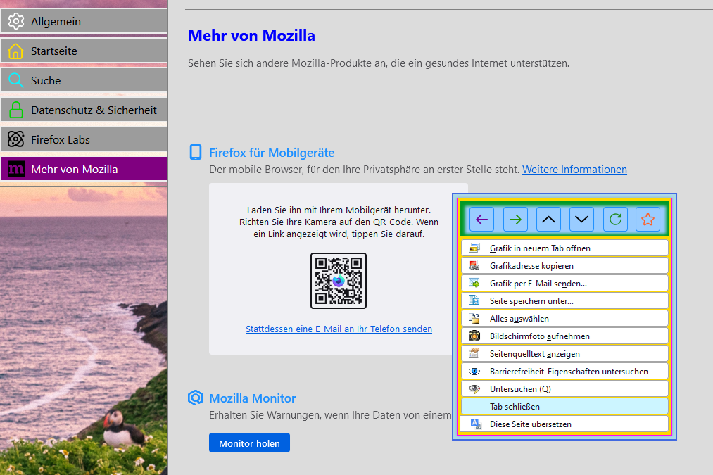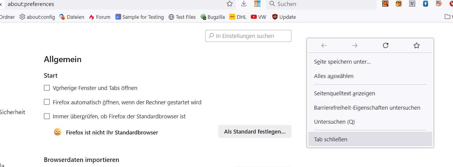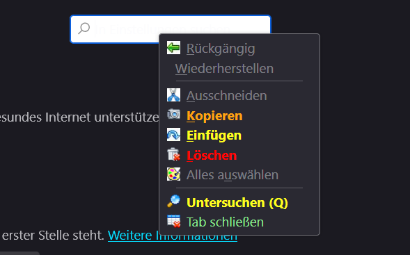 Damit gibt es auch ein Rechtsklick Kontextmenü in den Einstellungen bzw. den about: Seiten zum Schließen des Tabs.