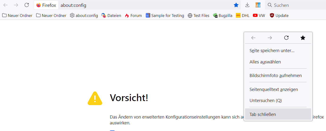 Damit gibt es auch ein Rechtsklick Kontextmenü in den Einstellungen bzw. den about: Seiten zum Schließen des Tabs.