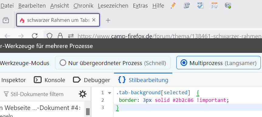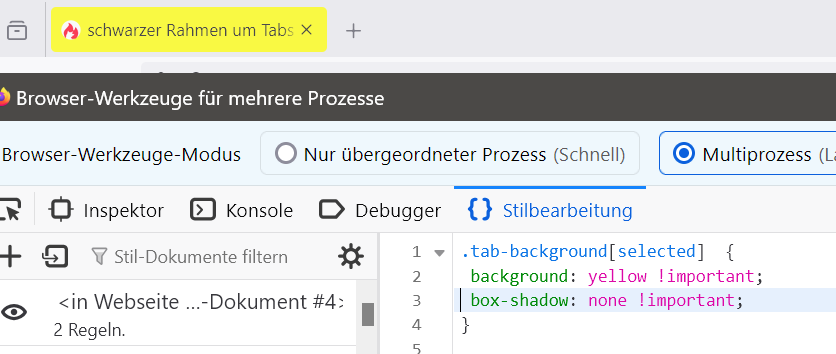 Jetzt hat der aktive Tab aber seit heute? einen schwarzen Rahmen. Wie kann ich den entfernen? Die Ergänzung "background-color" mit der gleichen Farbe wie der Hintergrund hat nichts gebracht.