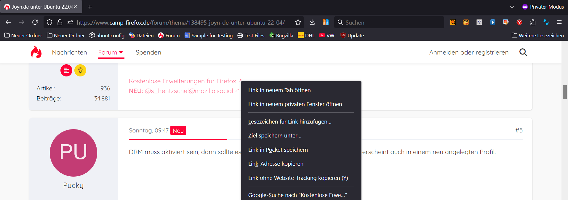 seit neustem ist in prvaten Fenstern der Kontext-Menüeintrag "Link ohne Website-Tracking kopieren" ausgegraut. Im "normalen" Fenstern ist der Eintrag verfügbar. Weiß draüber jemand etwas?