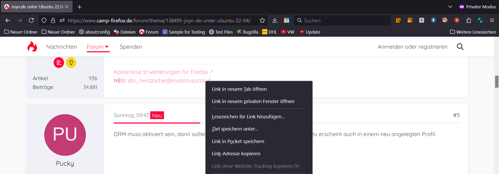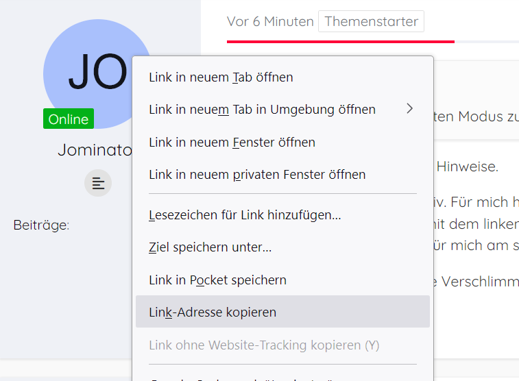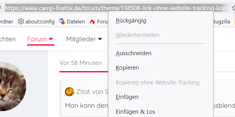 Aber nochmal: Diese ganze Diskussion ist sowieso überflüssig, weil es mit der Frage, wieso der Kontextmenü-Eintrag „Link ohne Website-Tracking kopieren“ in Firefox ausgegraut ist, nicht das Geringste zu tun hat. Das ist einfach ein komplett zusammenhangsloser Vergleich.