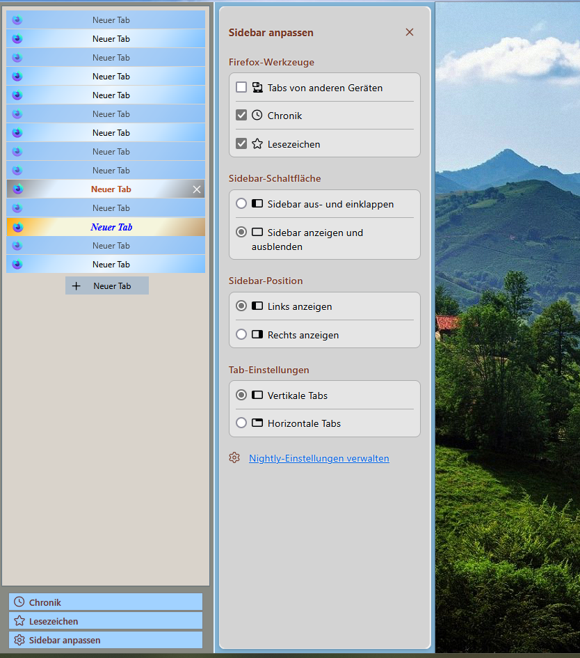 Ich habe mal die neue Funktion im Nightly bzgl. der Tableiste auf der linken Seite ausprobiert und bin total begeistert. Das funktioniert ganz wunderbar, ich brauche nun kein Javascript mehr wie vorher, alles läßt sich über die Einstellungen regeln. Auch das Ausblenden der Titelleiste funktioniert damit, das war ja ein Punkt, der sich im 128esr nicht richtig steuern ließ. Ich habe zwar noch etwas Hand angelegt mit CSS, um das Aussehen an das Systemtheme anzugleichen, aber nichts Großartiges. Ganz ausgezeichnet von den Mozillas gemacht. Ich habe mal ein Bild angehängt: