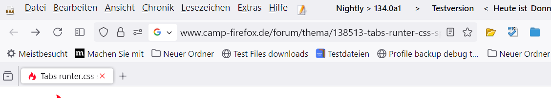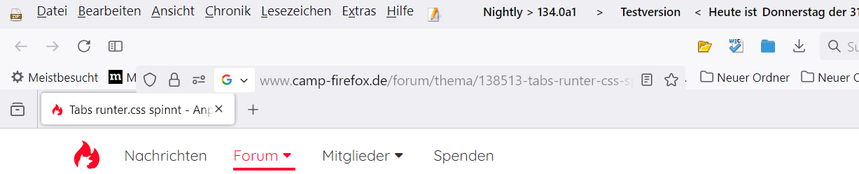 Erst wenn ich den u.a. Code deaktiviere habe ich die Erscheinung, dass die URL-Bar in die Tabs rein reicht, beim Browserstart nicht. Allerdings sieht das Ganze dann nicht gut aus und ich möchte die Tabs ja unter der URL-Bar haben.