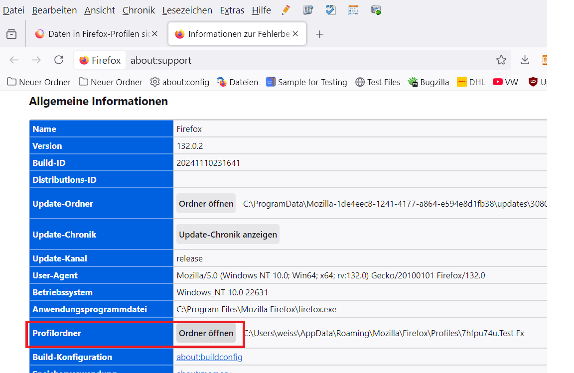 Eine weitere Möglichkeit ist die Funktion Profilordner öffnen zu verwenden in dem Menü mit den 2 Quer-Strichen in der oberen rechten Ecke des Firefox Fenster -> dann auf Hilfe klicken -> dann auf "Weitere Informationen zur Fehlerbehebung".![]()
