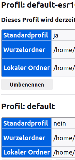 • Wie Profile angelegt werden, weiß ich. Mir scheint, es ist immer noch nicht klar, was gemeint ist. Zur ersten Frage jedenfalls füge ich hier zwei Anhänge hinzu. Der erste: Zustand vor Anlage neuer Profile. Der zweite: Zustand, nachdem die neuen Profile angelegt und die alten entfernt wurden. Bisher jedenfalls habe ich noch keine Erklärung dafür gefunden, warum neue Profile keine Verweise auf "Lokale Ordner" enthalten - geschweige denn, wie sie hinzugefügt und entsprechende Pfade definiert werden können-