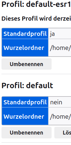 • Derzeit sind nur die beiden neuen Profile hinterlegt. Das Standardprofil funktioniert einwandfrei. Ein Cache-Ordner mit dem Namen firefox-esr (statt einfach nur firefox) wird automatisch generiert. Den Pfad gibt es also, aber in about.profiles erscheint der Ordner nicht.