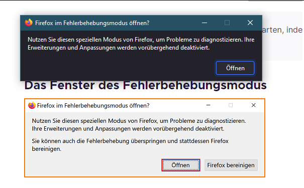 Da das aber deine alten Daten sind, wird es das Problem mit GMX noch geben. Jetzt kommt wieder der Fehlerbehebungsmodus ins Spiel. Wenn du den jetzt startest, klicke also bitte jetzt auf die linke Schaltfläche. Im Fehlerbehebungsmodus schaust du dann, ob es das Problem mit GMX noch gibt. Wenn nicht, liegt die Ursache, wie ich oben schon geschrieben habe, bei einem Add-on, bei der Hardwarebeschleunigung, bei CSS oder Benutzerskripten, falls du beides oder eines davon verwenden solltest. Melde hier, was im Fehlerbehebungsmodus passiert.