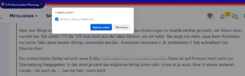 Aber das Skript scheint so zu funktionieren. Ich habe das nach den Änderungen in mozilla central gemacht, die Sören oben verlinkt hat. Die Zeilen 173 bis 178 sind noch aus der alten Version, die ich hatte. Sie sorgt nur dafür, dass beim Schließen nur eines Tabs diese beiden Strings verwendet werden. Ansonsten erscheint z. B. stattdessen 1 Tab schließen? als Standardtext.