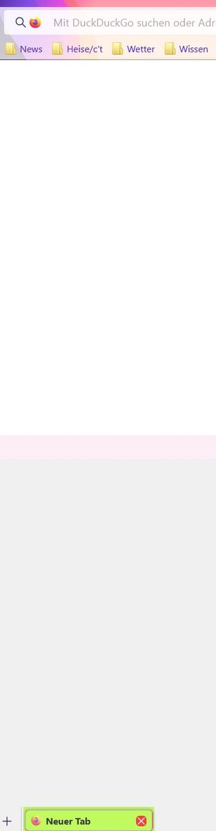 Alles anzeigen(function() { if (location != 'chrome://browser/content/browser.xhtml') return; var tb = document.createXULElement('toolbar'); tb.id = 'new-toolbar'; tb.setAttribute('customizable', true); tb.setAttribute('mode', 'icons'); var vbox = document.createXULElement('vbox'); document.getElementById('navigator-toolbox').parentNode.insertBefore( vbox, document.getElementById('browser-bottombox')); //vbox.style.backgroundColor = 'floralwhite'; vbox.appendChild(tb); CustomizableUI.registerArea('new-toolbar', {legacy: true}); CustomizableUI.registerToolbarNode(tb); })();- Tabs runter.uc.js