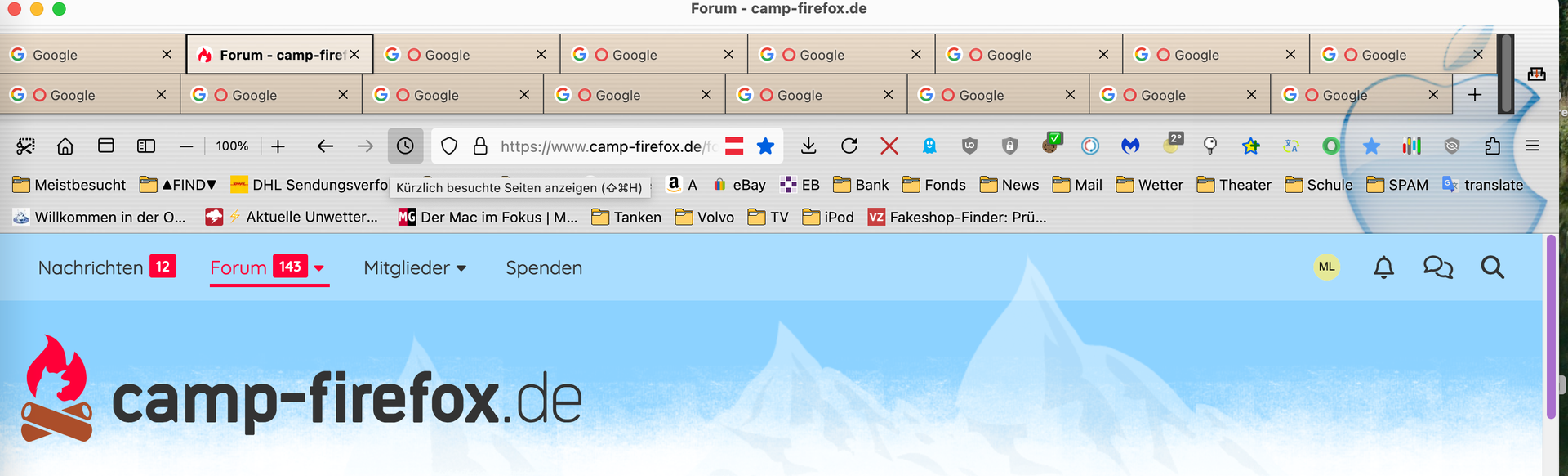 Mit der Version FF133.0 hat sich gegenüber der Vorgängerversion FF 132.0.2. das Erscheinungsbild dahingehend verändert, dass sich die Tableiste nun nach oben verschoben hat und nicht mehr unter der Lesezeichensymbolleiste sondern darüber angeordnet ist. Die anderen Einstellungen meiner userChrom sind erhalten geblieben, es hat sich nichts weiter verändert. Für beide Situationen habe ich hier jeweils ein Bildschirmfoto.