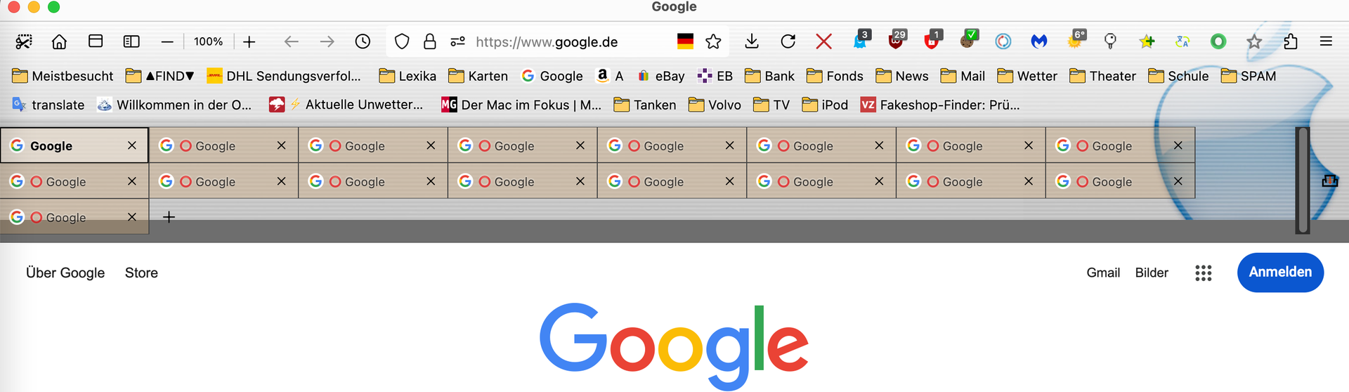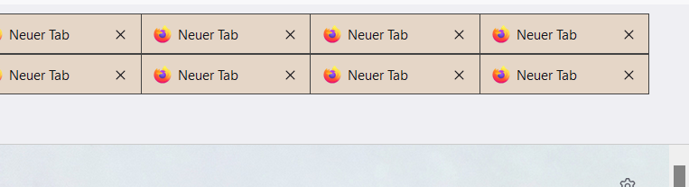 Ein weiteres Detail ist dabei jetzt noch zu sehen: am unteren Rand der Tableiste entsteht, wenn man mehr als zweiTabzeilen aufruft, ein schwarzer Balken. Gibt es dafür eventuell auch eine Änderung in der userChrome, die diesen Balken vermeidet? Zwei Bildschirmfotos hierzu füge ich wieder bei: