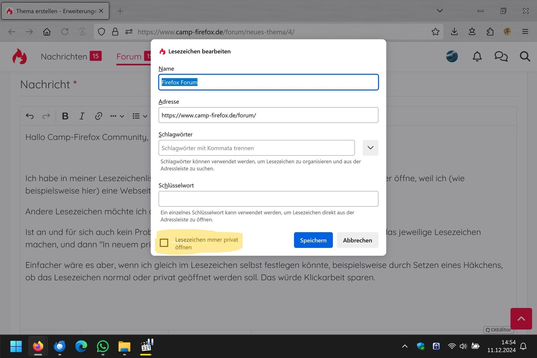 Einfacher wäre es aber, wenn ich gleich im Lesezeichen selbst festlegen könnte, beispielsweise durch Setzen eines Häkchens, ob das Lesezeichen normal oder privat geöffnet werden soll. Das würde Klickarbeit sparen.