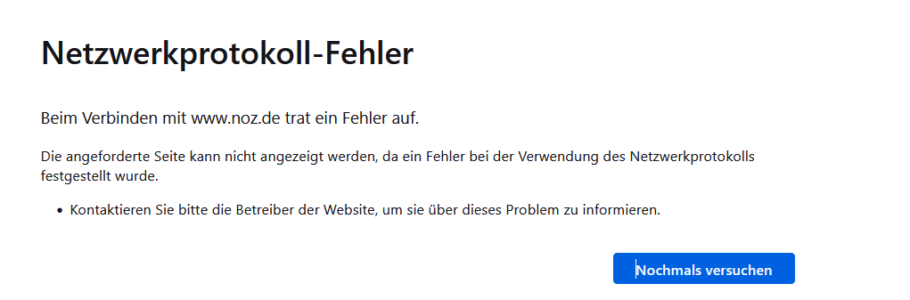 was ich vergessen hatte, ist, dass gelegentlich beim Start von FF die Noz.de-Seite nicht geladen wird und zwar mit dieser Meldung: