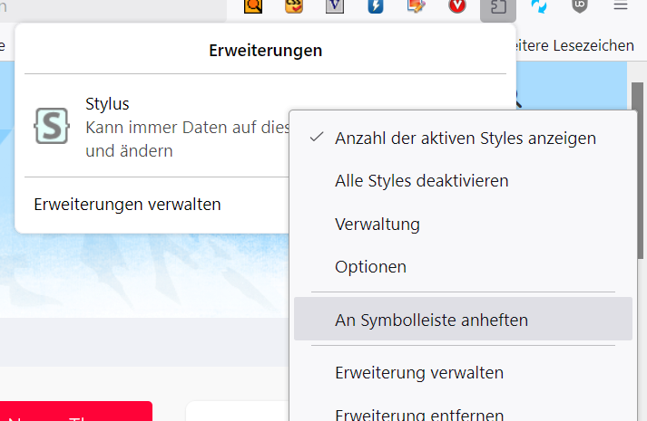 Möchtest du die auf die Leiste haben, dann musst du einen Rechtsklick auf die Erweiterung machen, und das hier anklicken: