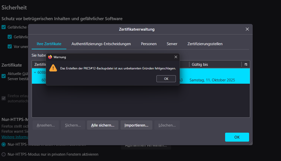 Das Erstellen der PKCS#12-Backupdatei ist aus unbekannten Gründen fehlgeschlagen