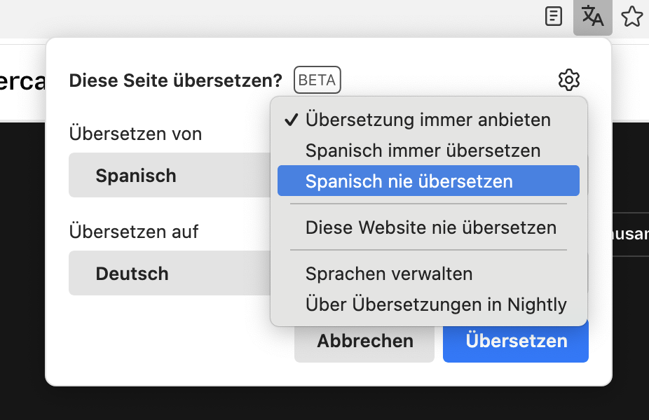 Und dieses Übersetzungsding da, hätte ich gerne weg. nervt mich auch, da es mal da, mal weg, mal da ist und ich es in dem Tab gar nicht anwenden könnte, da es nicht "automatisch alles übersetzt werden kann" (hat mehrere Fenster und das allermeiste ist eh deutsch und das andere ist ne E-Mail die eh Deutsch ist, daher nervt mich das halt). wenn ich was übersetze, dann Google Übersetzer oder Deepl (oder beide wenn Text unlogisch ist) . daher möchte ich sowenig wie möglich, das mich nervt, wenns geht