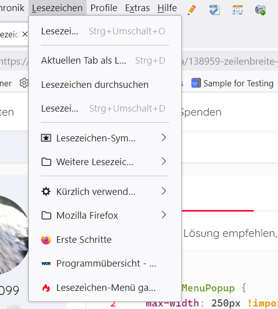Vor ein paar Jahren wurde der Zeilenabstand bei den Lesezeichen geändert. Seitdem habe ich das Problem, wenn ich mehrere verschachtelte Ordner habe, dass ich mit der Maus über den Namen des Unterordners fahren muss um den nächst tiefere Unterordner zu erreichen. Dabei passiert es leicht, dass ich die Zeile mit der Maus verlasse und muss dann wieder von vorne anfangen.