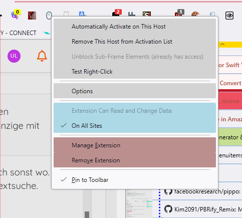 Generell bin ich aber wie angesprochen dafür, den Entwickler zu fragen, ob er so einen Schalter (für das Webseitenkontextmenü) einfügen kann - wobei das nicht für jede Erweiterung Sinn macht, vor allem die, die eh nur via Kontextmenü arbeiten können.