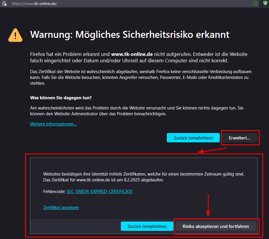 • Laut Mitteilungskasten ist wohl ein ausgelaufenes Zertifikat der Webseite dafür verantwortlich.