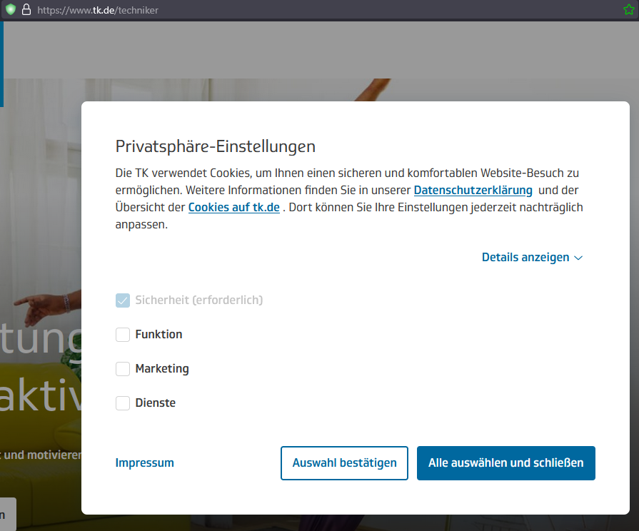 Bei der Webseite, die ich nach dem letzten Update der Firefox-Version nicht mehr öffnen konnte, handelt es sich um diejenige der Techniker Krankenkasse (https://www.tk.de/techniker).