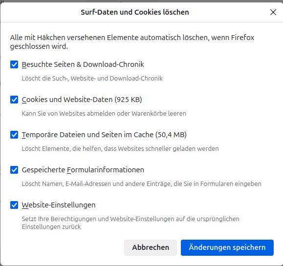 Klicke ich nun bei der Chronik auf "Einstellungen", bzw. bei Cookies und Website-Daten auf "Daten entfernen" wird jeweils ein Fenster mit identischen Optionen angezeigt. In beiden Fenstern habe ich folgende Optionen aktiviert, was auch exakt meinen Eingaben entsprechend ausgeführt wird.