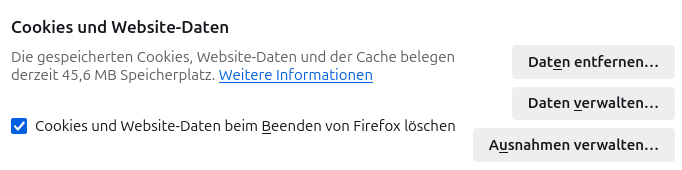 Klicke ich nun bei der Chronik auf "Einstellungen", bzw. bei Cookies und Website-Daten auf "Daten entfernen" wird jeweils ein Fenster mit identischen Optionen angezeigt. In beiden Fenstern habe ich folgende Optionen aktiviert, was auch exakt meinen Eingaben entsprechend ausgeführt wird.
